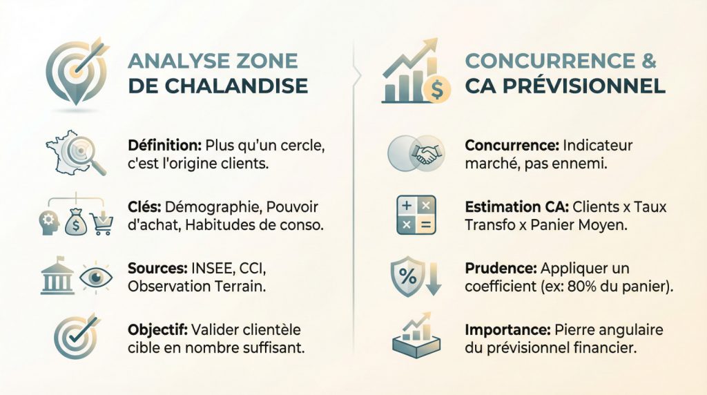 - Analyse obligatoire de la zone de chalandise : clientèle cible, concurrence, pouvoir d’achat, pour estimer un CA prudent.